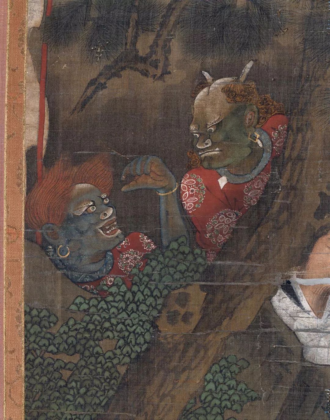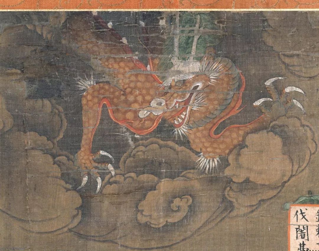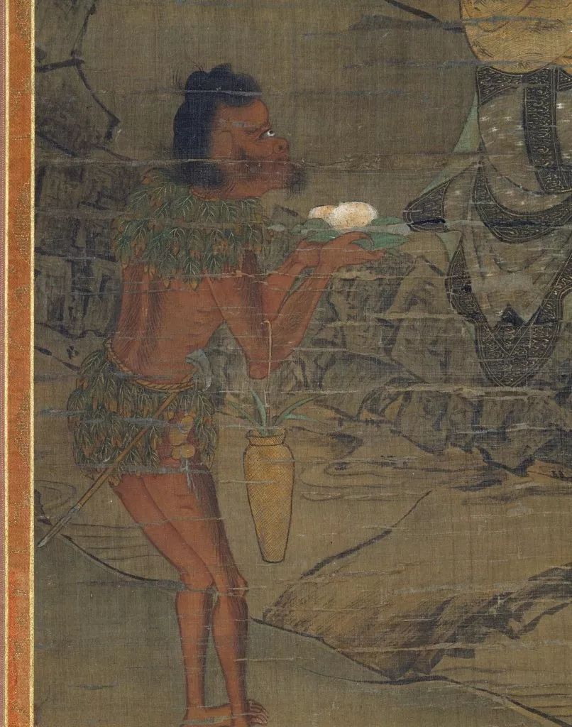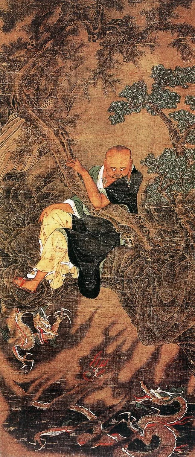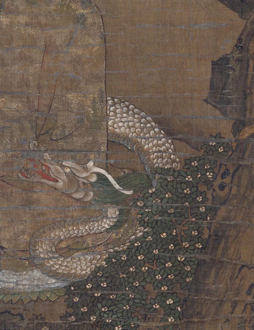 此图中降龙罗汉形象十分特殊和有趣,图下方有两条飞舞的龙,围绕一宝珠张牙舞爪,罗汉紧张地攀于岩石旁的树上,两眼圆瞪,惊恐万状,十分富有戏剧性。画风细腻工整,具有院体风格。