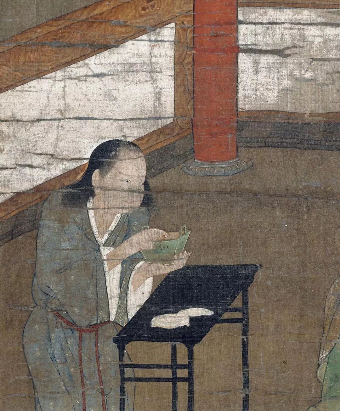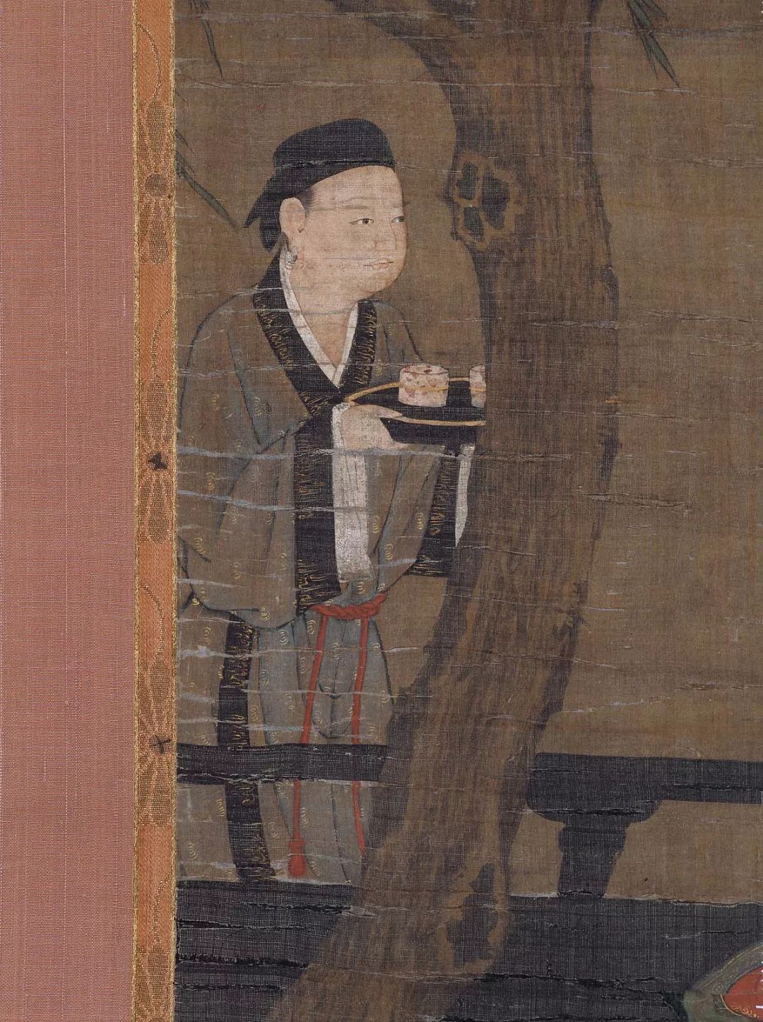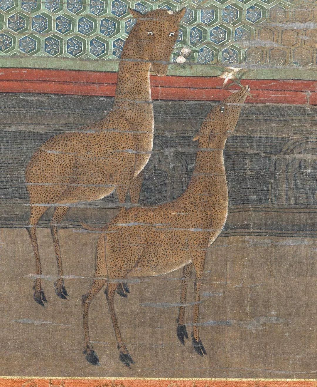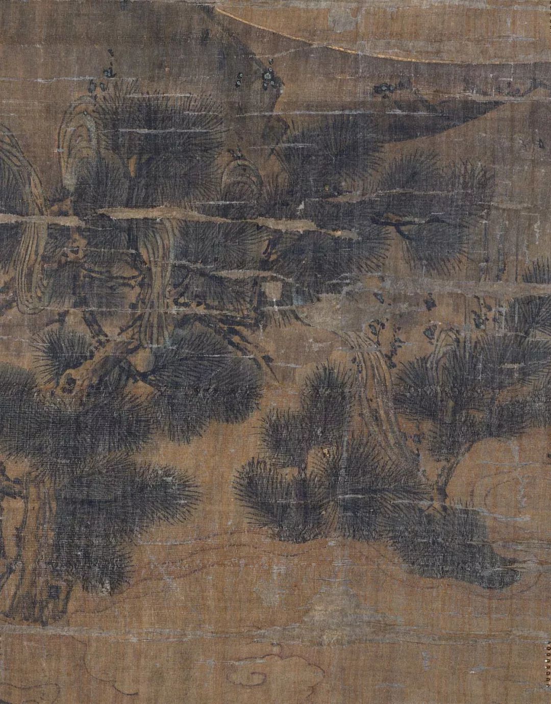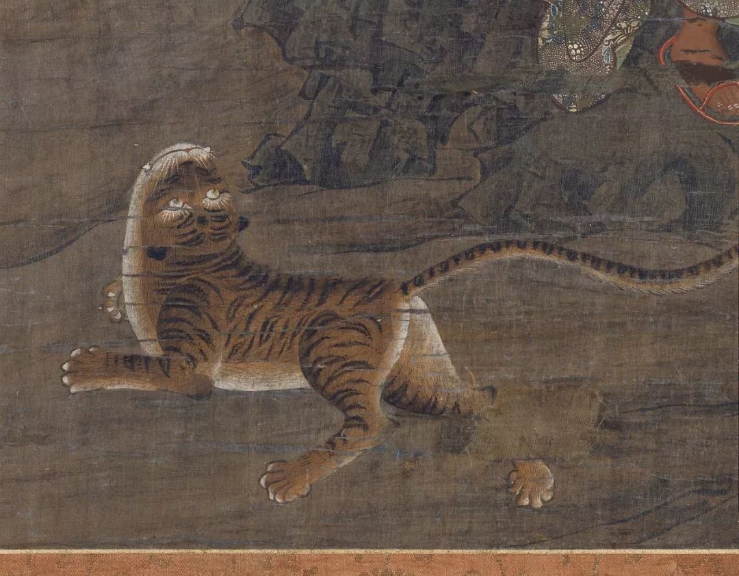 此图中降龙罗汉形象十分特殊和有趣,图下方有两条飞舞的龙,围绕一宝珠张牙舞爪,罗汉紧张地攀于岩石旁的树上,两眼圆瞪,惊恐万状,十分富有戏剧性。画风细腻工整,具有院体风格。