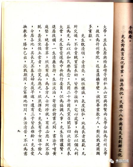 先生对教育文化事业,极具热忱。民国十八年与葛天民创办文化大学,并在太原与杨泰嵘等将私立山右与兴贤两大学合组为并州大学,后改为并州学院。迄卢沟桥事变,该院毕业数千人,对抗战建国颇多贡献。