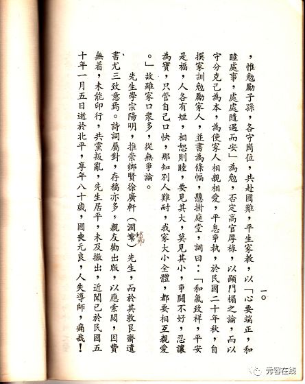 先生学宗阳明,推崇乡贤徐广轩(润第)先生,而于其《敦艮斋遗书》尤三致意焉。诗词属对,存稿亦多,亲友劝出版,以应索阅,因费无着,未能印行,□□□□,先生居平,未及撤出。近闻已于民国五十年一月五日逝于北平,享年八十岁。国丧元良,人失导师,痛哉!