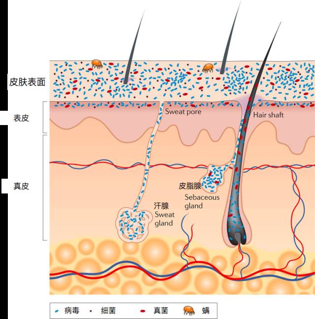 皮肤你看着是一层皮,其实上面有很多微生物(病毒、细菌、真菌和螨),是一个小系统。