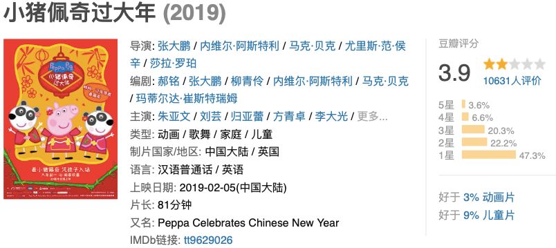 2019年春节期间,阿里影业与英国Entertainment One合拍的动画电影《小猪佩奇过大年》上映,靠病毒式营销打响知名度,然而豆瓣评分只有3.9,差评满满,被网友称为新年首部“诈骗片”。