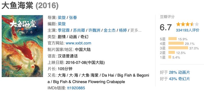 2016年,光线担任联合出品的动画电影《大鱼海棠》上映,制作公司正是光线投资的彼岸天。虽然剧情、人设都有瑕疵,但《大鱼海棠》还是获得了豆瓣6.7分和技术、画面上的一致好评,接过了《大圣归来》传递来的国漫薪火。