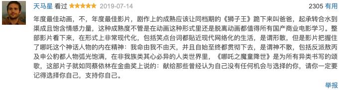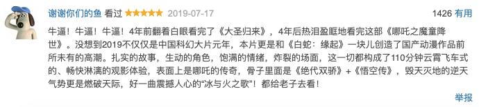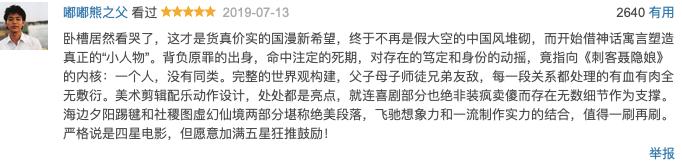 豆瓣热评点赞数最高的几条中,网友评价《哪吒》是“货真价实的国漫新希望”、“年度最佳影片”、“国产动漫作品前所未有的高潮”。