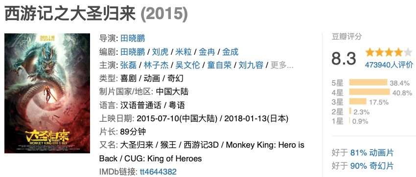 2015年暑期档,动画电影《大圣归来》上映3日票房破亿,在“自来水”浇灌下迅速破圈,最终狂揽9.56 亿票房,刷新了国产动画电影的票房纪录,超过47万人给这部动画电影打出8.3的高分。让传统五大影视公司之一的光线传媒,对国内动画市场燃起“野心”。