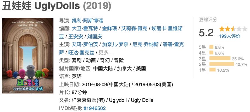暑期档另一部带有混合基因的动画电影《丑娃娃》,同样由阿里影业投资。今年5月3日《丑娃娃》在北美公映,IMDb评分仅4.6分,上映第一周就未能进入周末票房榜前三甲。