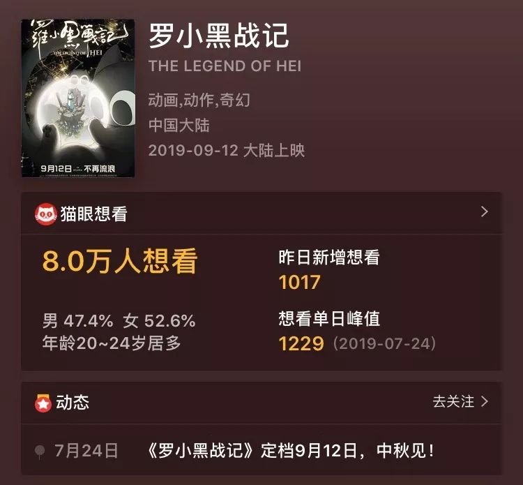 选择《罗小黑战记》这个IP进行大电影的开发,解决了动漫“经费不足”的困扰,引起粉丝期待。影片采用原班人马制作,细节、质感有所保障。在猫眼电影上,有超过7万人标记了“想看”。