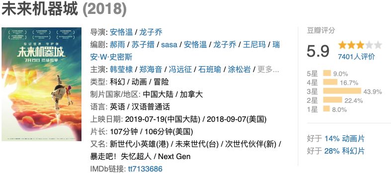 “中加混血”的《未来机器城》制作水平是过关了,但剧情却落入俗套,被网友嘲讽是“披着精美外衣的平庸之作”,豆瓣评分仅5.9。