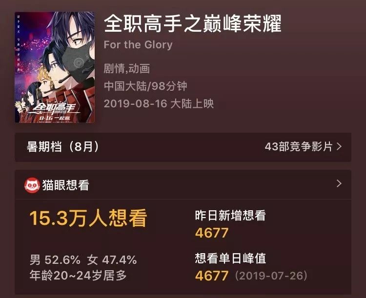《全职高手之巅峰荣耀》讲述的是大神级职业电竞选手叶修带领团队克服困难走上荣耀巅峰的故事。虽然不及西游IP普及率高,但有小说漫画在前,仍有15.3万人在猫眼平台上标记了“想看”。