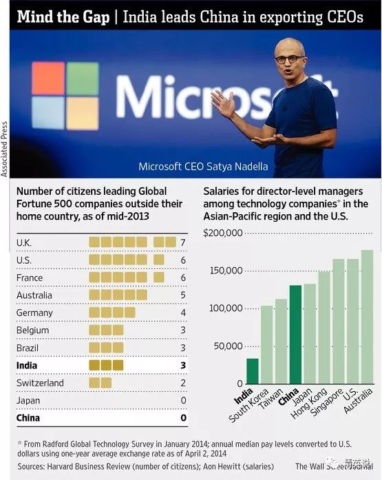 《华尔街日报》曾在一篇名为《比起中国,印度是如何输出那么多 CEO 的(How Does India Export So Many More CEOs Than China?)》的文章中,也提出过这个问题。
