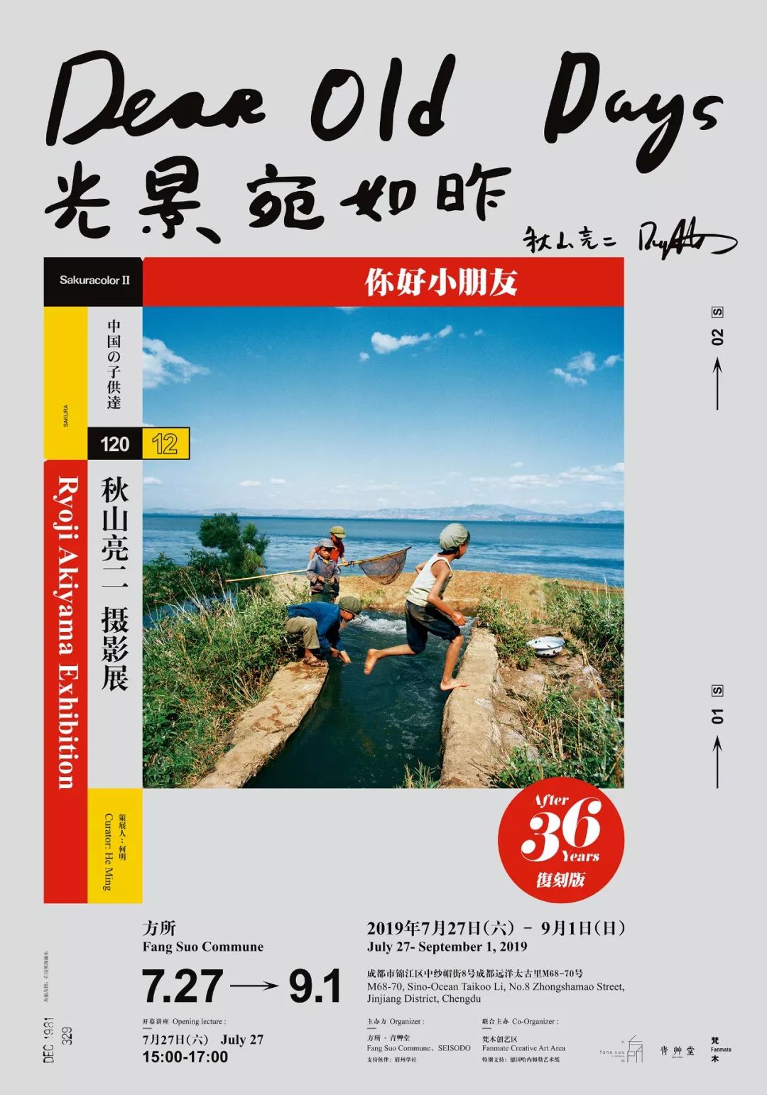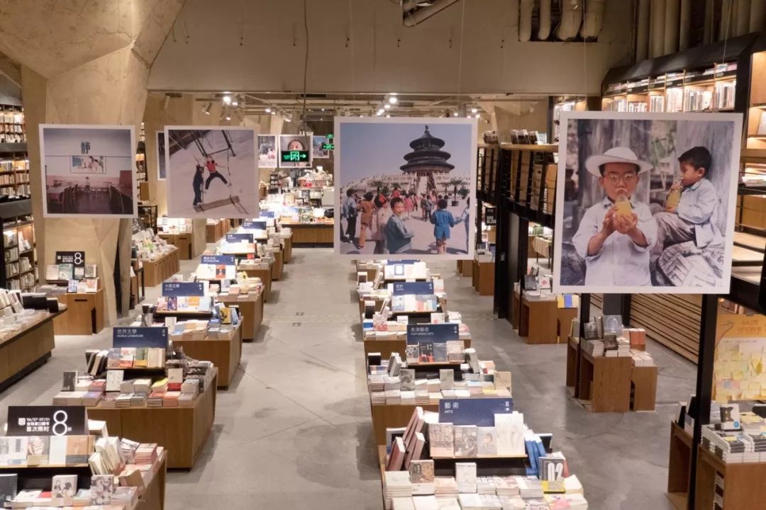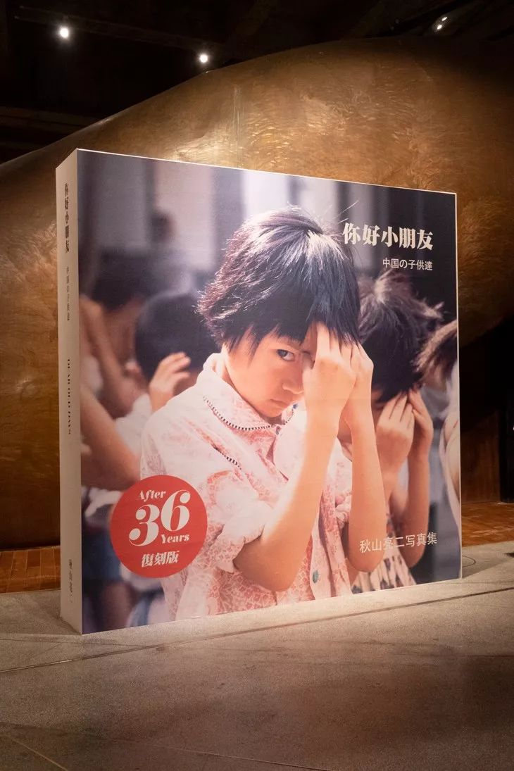 A:展览的名字没有直接用你好小朋友,而应用了李叔同《忆儿时》中的一句“光景宛如昨”作为展览主题,时间、记忆是整个策展轴里最核心的思考点。走进方所成都店后会先看到巨型的“书”——1983版的摄影集封面,它作为一个开端,再走到另外一端的入口就会看到2019年复刻版的封面,这个中轴线之间我把它理解成一个时间轴。上空悬挂了十二个城市部分的作品,是一种时间、地点的联接,也是动线视觉导示。