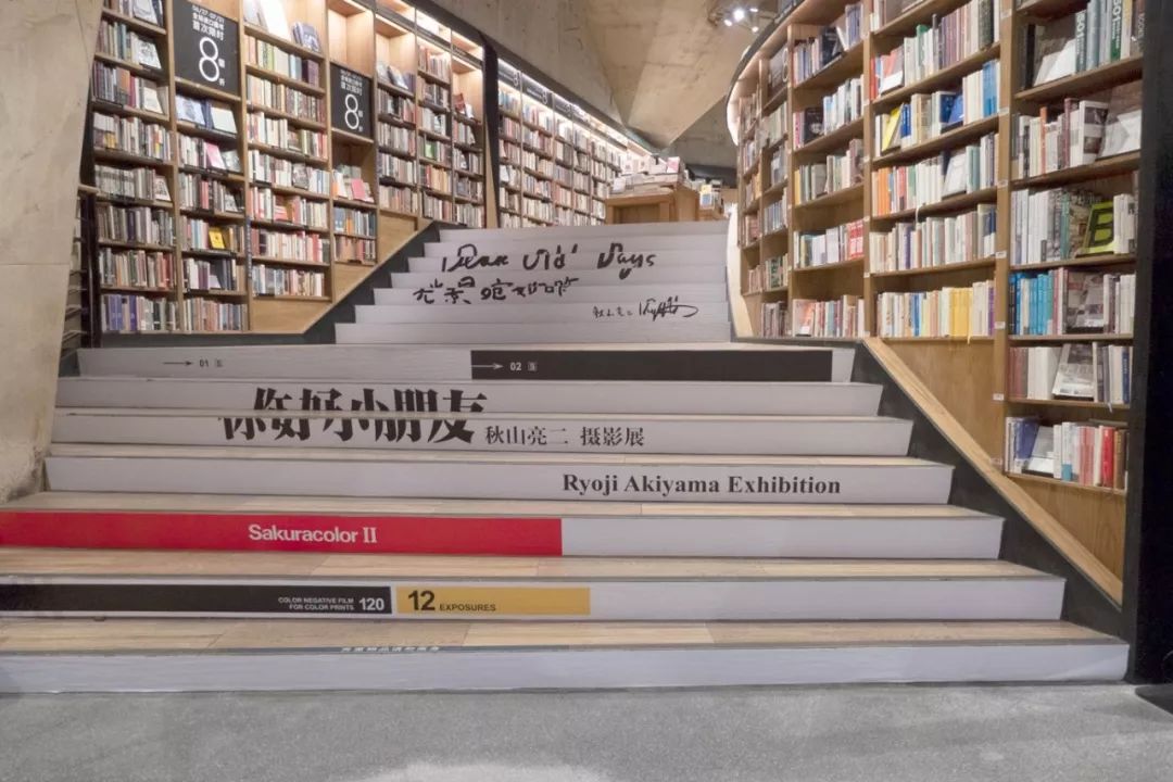 方所成都店的楼梯,每个阶梯横幅标语将海报中的部分元素:秋山先生拍小朋友们时所使用的樱花牌胶卷型号、手写的展览主题、签名……都恰如其分融入进去。