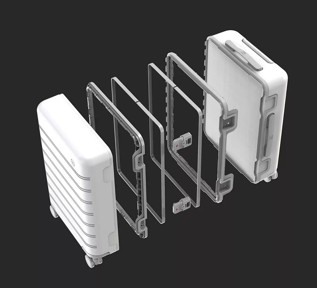 设计师采用一面富有摩登感,一面成熟又轻盈的色彩搭配,设计出蓝灰、红粉、白棕这三款双面撞色旅行箱。