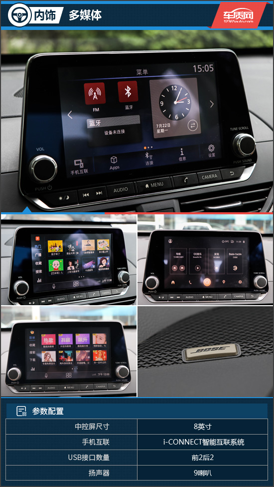 8英寸悬浮式中控大屏内部搭载了NISSAN i-CONNECT智能互联系统,内部UI设计简洁,显示效果非常直观。该系统集成了高德导航、酷我音乐、百度Car-Life、语音识别、蓝牙电话等功能。在实际体验过程中,触控屏幕的反应速度和灵敏度都没有问题,非常流畅。屏幕下方还有一排实体按键,操作手感尚可。在音响方面,试驾车型还配备了BOSE音响系统,音响和音质都得到了保证。