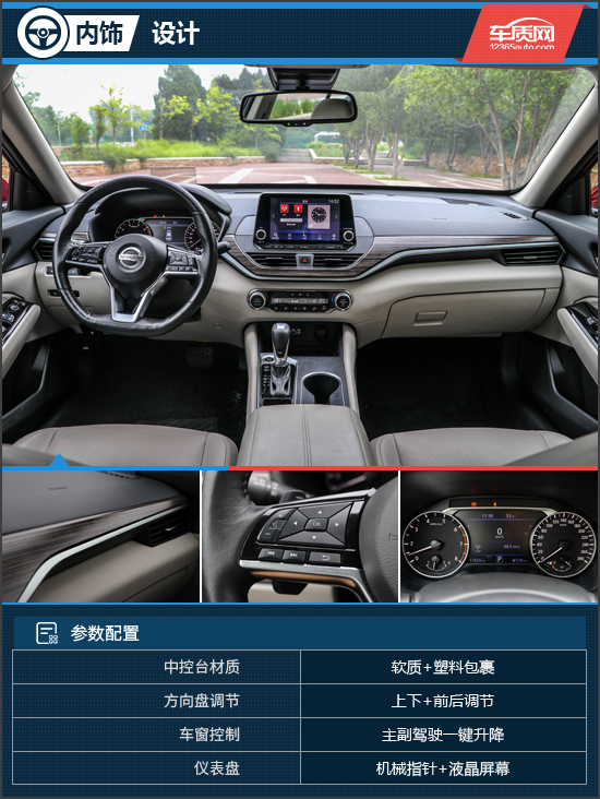 内饰方面,全新天籁的改变同样很大,虽然依旧是T字形布局,但中控台采用了分层式设计,并加入了大量木纹装饰和软质材料,豪华感油然而生。中控屏幕采用了时下流行的悬浮式设计,屏幕尺寸和显示效果也有所升级。全新设计的三辐式平底真皮方向盘手感极佳,两侧的多功能按键阻尼感较强,可对行车电脑和多媒体进行控制。在方向盘后部还配有换挡拨片,增加了我们的驾驶乐趣。仪表盘由7英寸液晶屏幕和机械指针共同组合而成,内部可显示导航、多媒体、行车电脑以及蓝牙电话等功能。