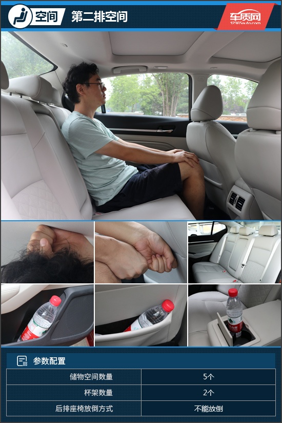 体验者来到后排,头部空间为一拳,腿部空间为两拳,空间表现尚可。需要注意的是,后排地台中央有明显凸出,会对中间乘客坐姿造成一定影响。后排门板同样采用分段式储物槽,表现与前门并无二致。只可惜后排杯架同样没有限位器,表现还有待提升。在后排空调出风口下边还设有一个USB接口,方便后排乘客为设备充电。