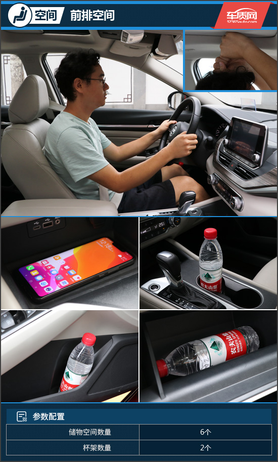 在日系品牌中,日产车的座椅一直以“沙发”著称,而这样的优势同样延续到了全新一代天籁上。身高180cm的体验者坐进车内调整好前排座椅后,头部空间还有两拳的余量,门板储物格在容下一瓶水后,还可以放入小本书籍等物品,实用性较高。前排杯架虽然纵深尚可,但内部没有限位器,如果放入较大水杯的话会出现固定不牢的情况。手套箱表现却很抢眼,具有较大空间很是实用。另外中控台下方的储物格可放入手机充电或是钥匙钱包等小件物品。