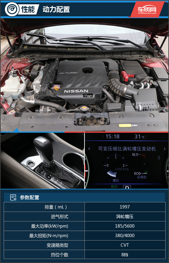 动力方面,全新一代天籁除了搭载2.0L自然吸气发动机外,还搭载了2.0T可变压缩比发动机,它通过连杆机构不断调整发动机活塞,从而起到转换压缩比的效果,该发动机可以在14:1-8:1之间智能无极切换。此外这台2.0T发动机还采用了多点喷射和直接喷射两种方式,来平衡各种工况下的效率和功率。参数上,这台发动机最大功率为183kW,最大扭矩380N·m。与发动匹配的是可模拟8挡的CVT变速箱。