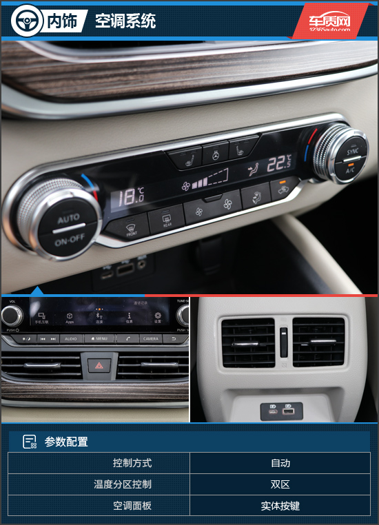 全新一代天籁的空调系统全部采用按键+旋钮设计,空调面板按键尺寸适中。经实测,该空调按键较为紧实,阻尼感清晰,制冷以及制热效果较快,但温度调节旋钮操作时略显松垮。另外,空调控制界面周围还采用银色饰条装饰,提升了车内的豪华感。值得一提的是,全新天籁全系标配后排空调出风口,提升了后排乘客的舒适性。