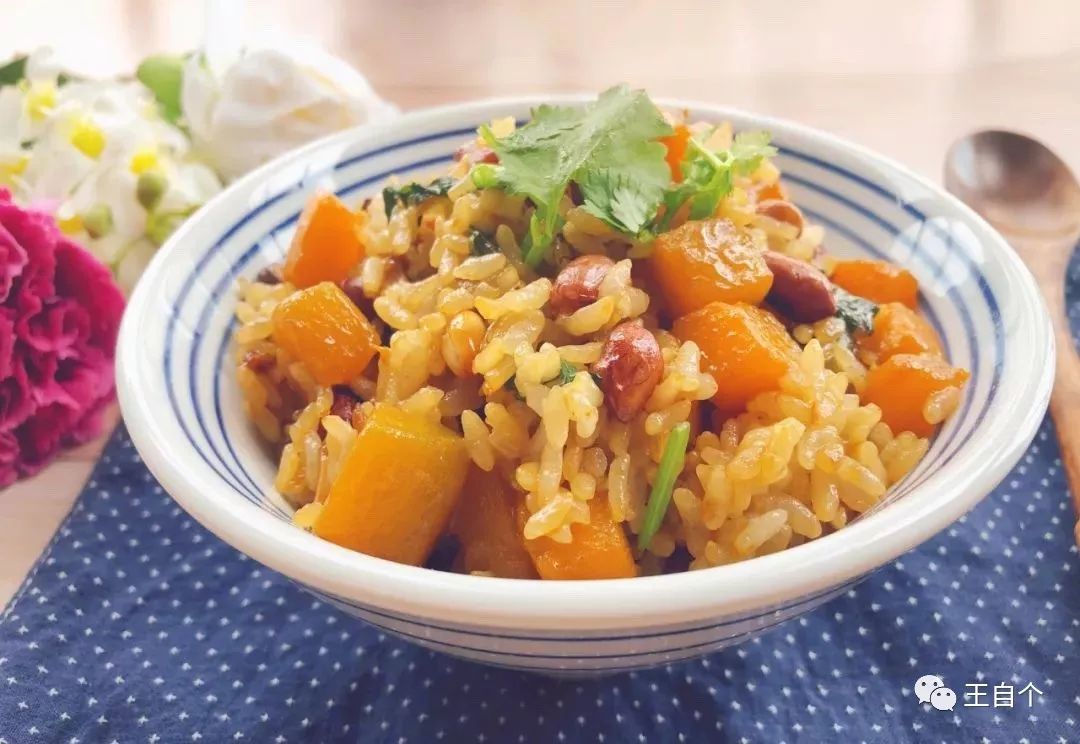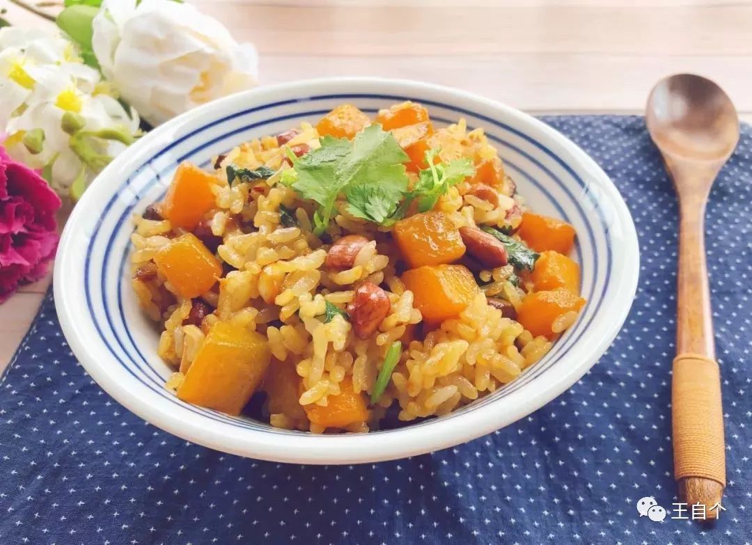 炒饭,可以是宵夜、早餐、午餐;炒饭是剩饭的华丽转身;炒饭可以加素,加肉,荤素搭配;炒饭老少皆宜,人人爱吃,是懒人的最好选择。香菇、南瓜和花生米都有各自鲜明的特征,三种食材混合在一起,给你的舌尖不同的惊喜,每次做这道菜饭都充满期待,关火起锅的一瞬间,简直要沉迷在喷香的雾气中,金黄油亮的色泽让人食欲大增胃口大开,加了南瓜的米饭,香甜香甜的,可好吃了。快快做起来吧 :)
