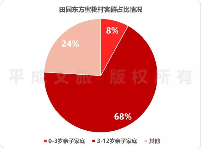 项目规划之初,田园东方蜜桃村就明确了亲子市场定位。通过2018年经营数据就可看出,0-3岁的亲子家庭占比为总客流8%,3-12岁占比为68%,0-12岁亲子家庭总量高达76%,这是一个标准的亲子型项目。而其亲子市场对应的父母亲则是25-40岁社会高薪及白领人群,作为主要消费人群足以支撑起项目的消费。
