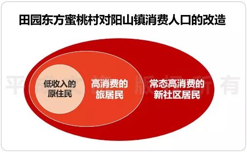 田园东方蜜桃村只是“田园综合体”模式探索的领头尝鲜者。阳山镇也因它创造的客流及社会舆论获得双重得益。从低端收入的原住民,到顺应旅游发展,创造了高消费的旅居民,再形成常态高消费的城镇新住民,围绕着蜜桃村一圈一圈产生了新城镇的经济带,创造了土地财政收入。这样的人口质量改造,为阳山镇创造了一个发展的奇迹,市场力跨越了政府力,让一个静态的郊区城镇成为一个活跃的消费城镇,碧桂园、万科的直接跟进,更是分享了“阳山镇文旅化”后的高红利。