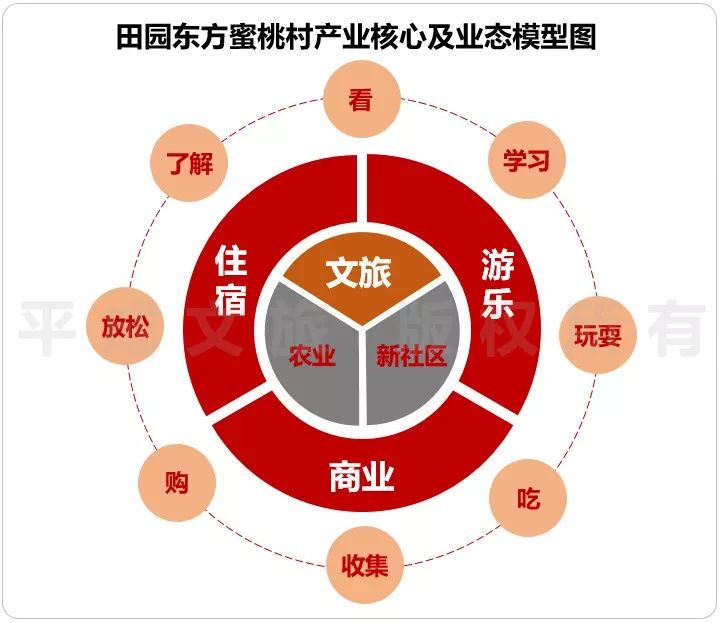 4.创造:精准定位亲子度假目标人群,以“蜜桃村”的符号,衍生旅游体验,开创 “文旅+农业+新社区“的田园度假区,并带动地产,创造田园综合体产业雏形,以无比精细化的“控制性”运营能力创造资源经营效率优势。