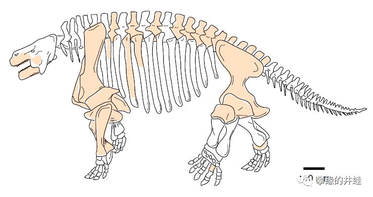 阿科坎瘤头龙骨骼结构和全身复原图。这个像牛一样大的家伙站立姿势也和牛一样,四肢和地面完全垂直。这是当时世界上最先进的肉体支撑结构,不要说其他的蜥形纲,连合弓兽们也还都在弓着腿跑呢。图片来源自[17]。