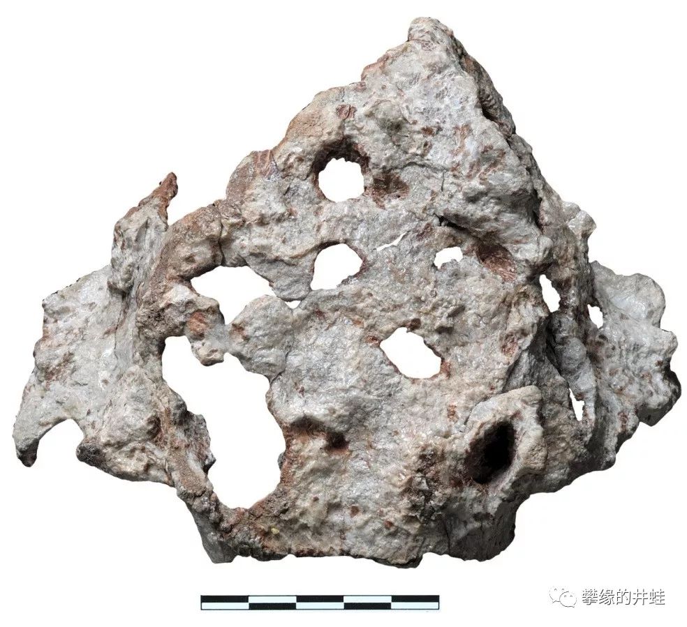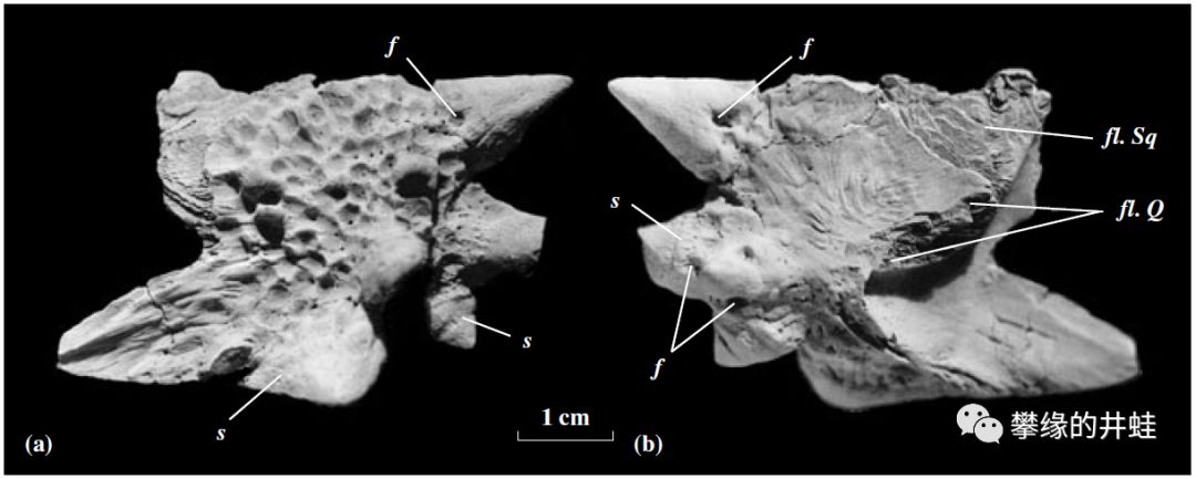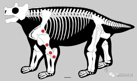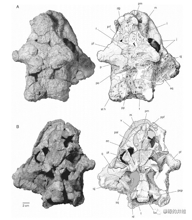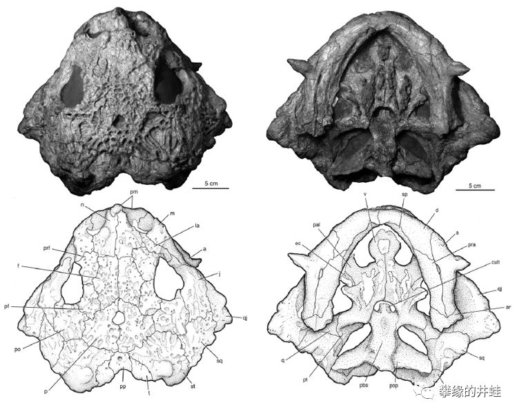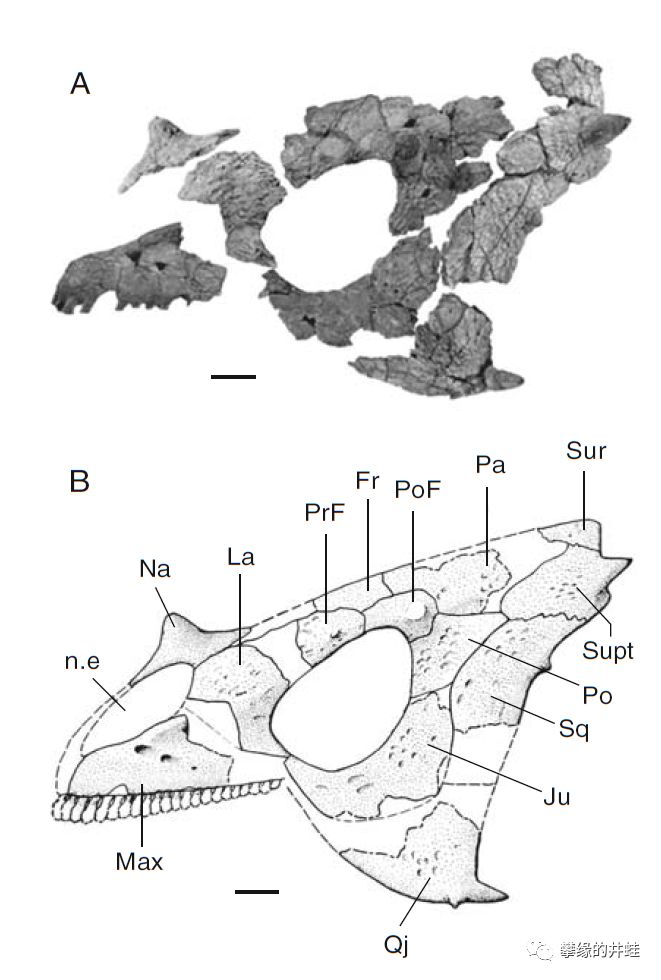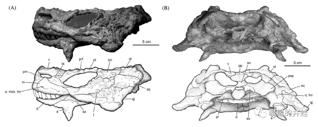 摩洛哥艾尔加奈盆地(Argana Basin)出土的艾尔加奈角龙Arganaceras vacanti头骨化石,虽然只是一堆碎片拼拼凑凑,仍然可以看到它的后脑,眉骨,下颌,还有鼻子上都有小小的“角”。图片来源自[4],标尺长度3厘米。