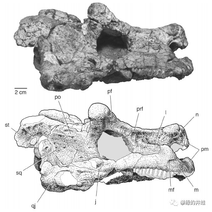 俄罗斯中部发现的晚二叠世锯齿龙Deltavjatia rossicus头骨化石。 它的下颌上有一对短“角”,不知道有什么功能。图片来源自[8]。