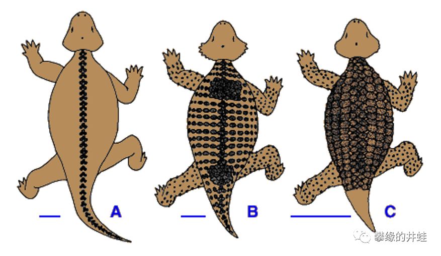 一些锯齿龙类群的背部骨甲发育。A:缓龙属;B:盾甲龙属;C:花齿龙属。图片来源自[5],标尺长度30厘米。