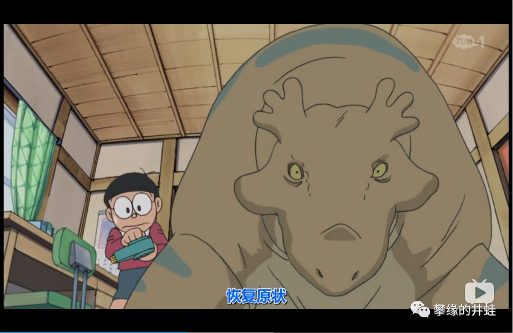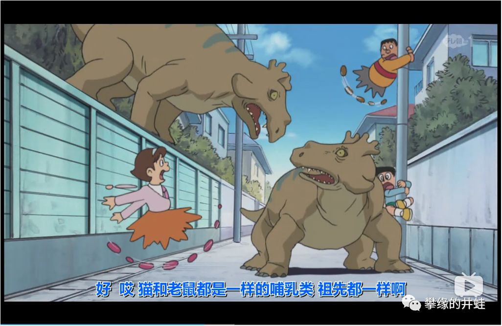图中这个憨头憨脑的大家伙是锯齿龙家族里的重量级角色,算是二叠纪的一个小明星。井蛙记得小时候看动画片《机器猫》(井蛙还是习惯叫机器猫,而不是哆啦A梦),有一集《进化退化射线》,这个形象就出现过: