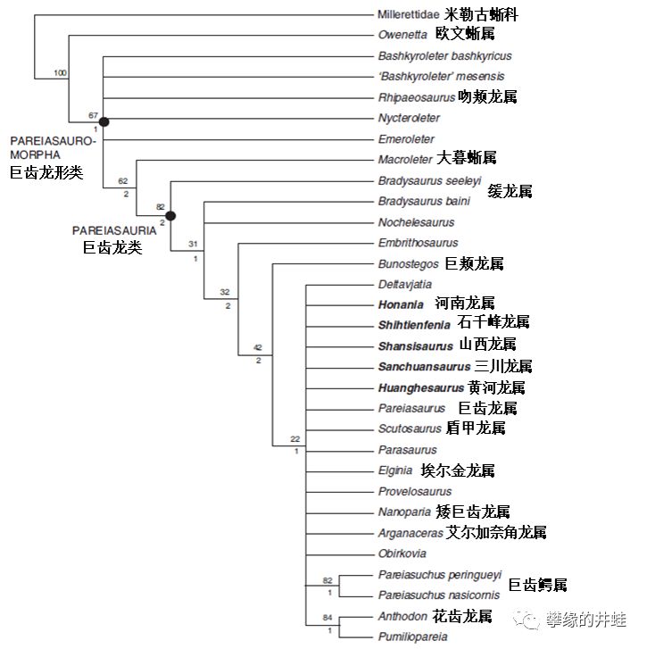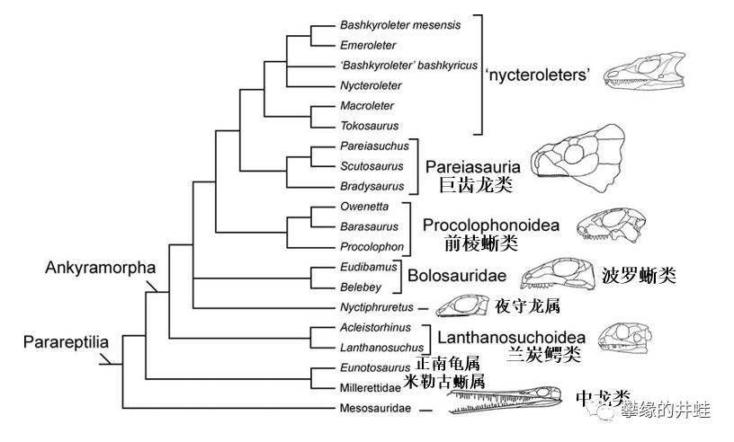 一个比较新的副爬行动物系统发生谱系。nycteroleters,锯齿龙类和前棱蜥类的关系表示得比较清楚。图片来源自[2]。