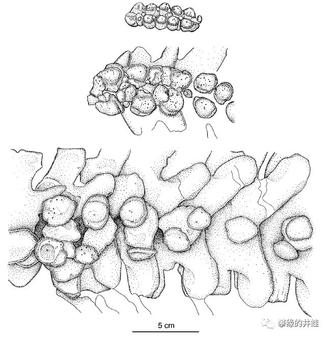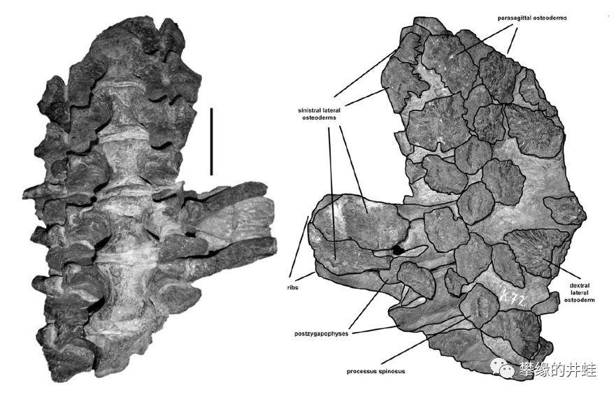 坦桑尼亚鲁胡胡盆地(Ruhuhu Basin)发现的锯齿龙(学名未定,疑似Pareiasaurus haughtoni)化石,保存了部分脊柱和肋骨。覆盖在脊柱上的不规则的碎片就是它的皮下骨板。图片来源自[15],标尺长度10厘米。