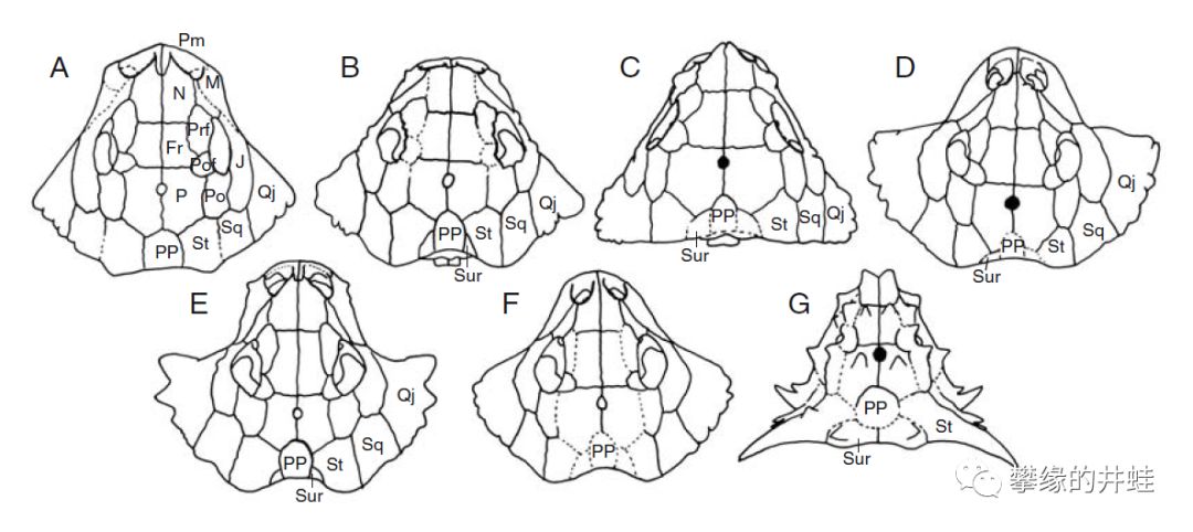 一些锯齿龙的头骨俯视图。A:Bradysaurus baini(缓龙属);B:Deltavjatia;C:Pareiasuchus nasicornis(锯齿鳄属);D:Pareiasuchus peringueyi(锯齿鳄属);E:Scutosaurus(盾甲龙属);F:Anthodon(花齿龙属);G:Elginia(埃尔金龙属)。可以看到锯齿龙头骨特化的趋势。图片来源自[4]。