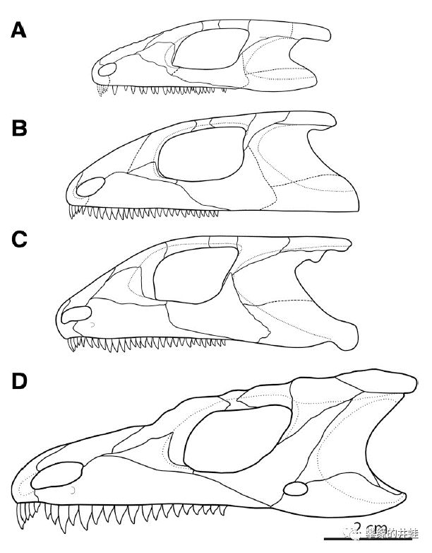 先来看看这货们的脑袋吧。锯齿龙的头骨坚固,没有颞颥孔,后脑部的鳞骨(Squamosal)和上颞骨(Supratemporal),还有脸颊部的方轭骨(Quadratojugal)延伸变形,组成一个像“头冠”的结构。演化后期的锯齿龙“头冠”上有许多角状或者瘤状突起,看起来更显得原始而怪异。