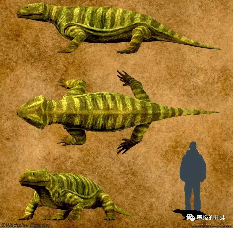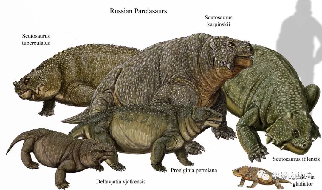 一些俄罗斯发现的锯齿龙类复原图和体型对比。右下的小不点属于埃尔金龙科,最大的三只全都是盾甲龙属的种类。在全世界所有的二叠系化石群中,以俄罗斯出土的锯齿龙化石种类最多,保存最完整。特别有代表性的是Deltavjatia属(左下的那只)和盾甲龙属,许多标本精美得让人嫉妒。图片来源自网络。