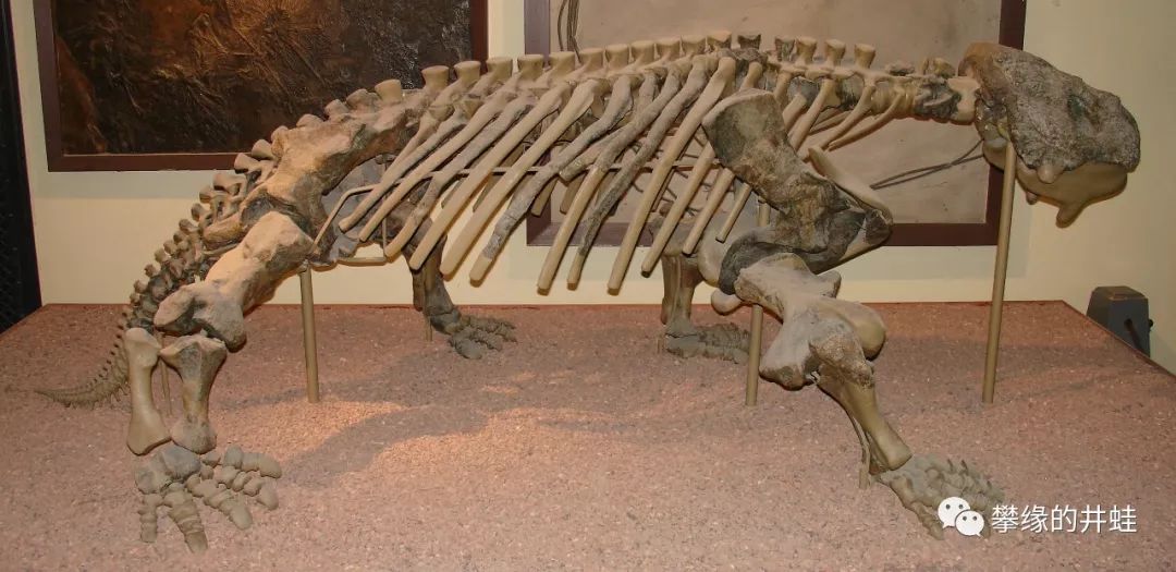 现存于布拉格恐龙博物馆的盾甲龙Scutosaurus karpinsikii完整骨骼。它们的腹腔里填满了膨大的消化系统。这么一个巨大的发酵罐肯定会产生大量沼气,我都能想象出这个大家伙放屁时有多壮观了。图片来源自Wikimedia。