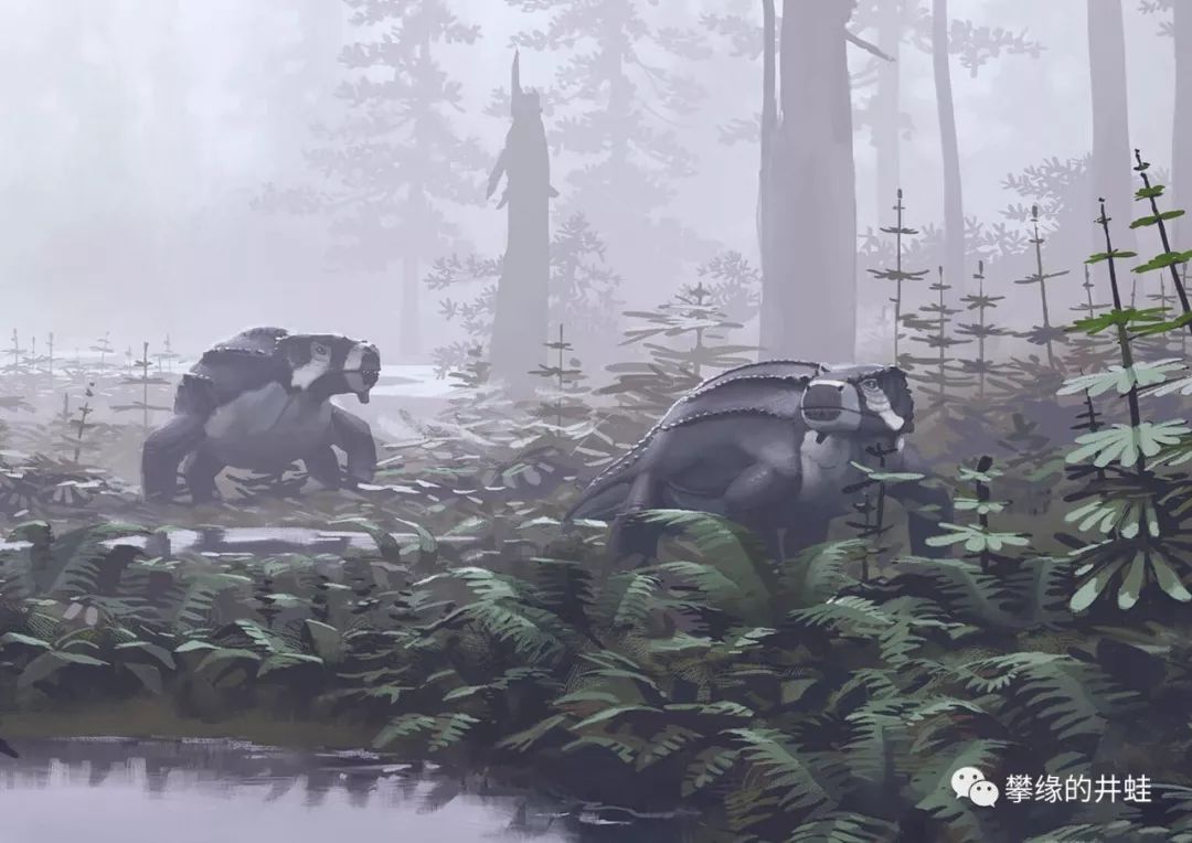 也许正是锯齿龙坚固的装甲,促使二叠纪晚期的肉食合弓兽演化出破甲的巨型剑齿和强大咬合力,然后又迫使锯齿龙提升防御手段。最终西伯利亚的超级火山彻底终结了这一轮猎手和猎物的军备竞赛。图片来源自网络。