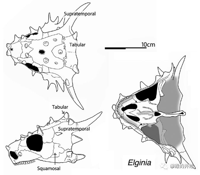 苏格兰发现的奇异埃尔金龙Elginia mirabilis是化石最完整,也最著名的埃尔金龙。这是它的模式标本化石(上图,来源自Wikimedia)和头骨结构图(下图,来源自[11])。