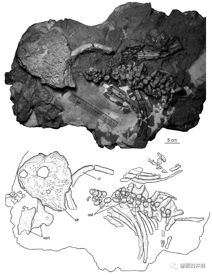 一头年轻的Deltavjatia rossicus化石。脊柱上那一串疙瘩(ost)就是它的皮下骨板。 图片来源自[8]。
