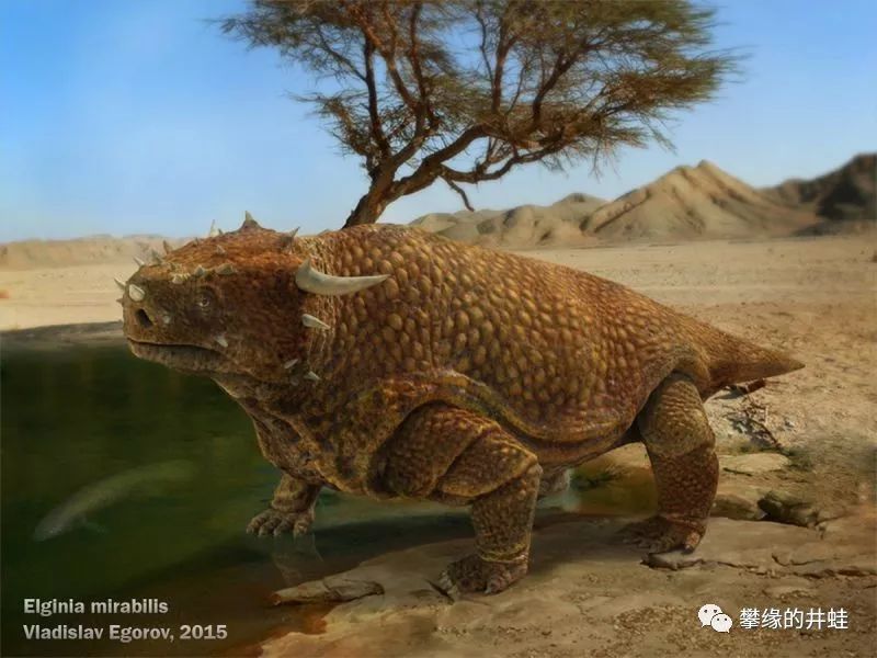 奇异埃尔金龙复原图。它的体长只有60厘米左右,大概相当于二叠纪的装甲绵羊吧。图片来源见水印。
