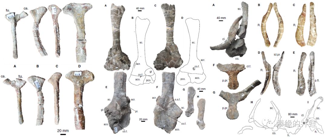 俄罗斯发现的埃尔金龙科的一个新属Obirkovia。模式标本Obirkovia gladiator(就是俄罗斯锯齿龙复原图上右下的那个小东西)化石是左方轭骨(Quadratojugal,大概在腮帮子的部位)的一小块碎片,能看到上面长着的小角。图片来源自[12] 。