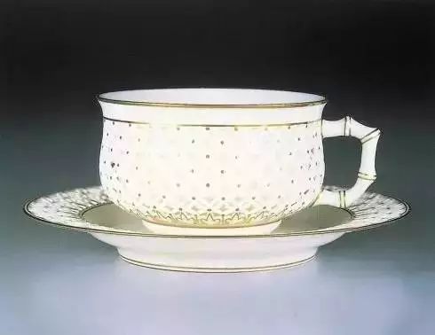 外层镂空雕花,于菱形四角点饰金彩,口足间金线四道,竹节把上,每节均饰金纹二道,内层白釉无纹;杯托盘口折沿亦镂空雕花,与杯身相同纹饰,盘内白釉无纹。
