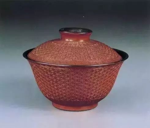 碗及盖内外均包银,外壁于素胎时雕刻成仿雕漆绣球纹锦地纹饰,口沿雕回纹一周,足边莲瓣纹,施透明釉烧成后,再挂珊瑚红釉,二次低温烧成。碗底白瓷地上矾红书「大清乾隆年制」六字三行篆款。