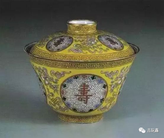碗内白地上满画粉彩梅花、蝴蝶,器、盖内外口沿及底边、圈足均画回纹一道,碗、盖外壁黄地上四圆形开光万字内各书「万」「寿」「无」「疆」,并围以如意云纹;开光间以蝙蝠、桃实、盘长等纹饰,寓意万寿无疆。盖圈足内及碗底朱红「长春同庆」四字二行楷款。