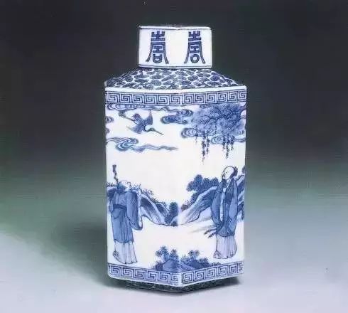 纹识描述:盖面青花绘一蟠螭,盖壁饰六字三种不同书法的「寿」字,加饰青线三道,罐肩满画如意纹,罐腹则饰山水人物画,云松下二老者,一抬头持杖遥指飞翔而来的仙鹤,另一老者及一背罐童子亦仰面迎望飞鹤,罐腹上下各饰回纹一周,足边则为转枝叶纹一周。底青花书「大清康熙年制」六字二行楷款。同类造型亦有锡制茶叶罐。