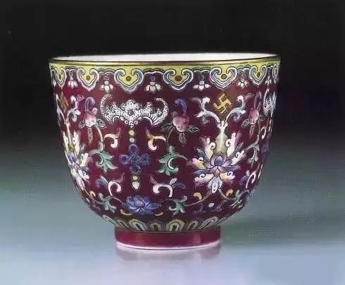 外壁紫红地饰粉彩,口沿下为如意纹一周,腹壁饰番莲四朵,其上各绘金彩万字符号,其间加饰蝙蝠口衔盘长结四组;蝙蝠与番莲之间又以桃实间隔,底边莲瓣纹一周,口足间则加饰金边二道。胎骨略重,器底红彩书「大清嘉庆年制」六字三行楷款。