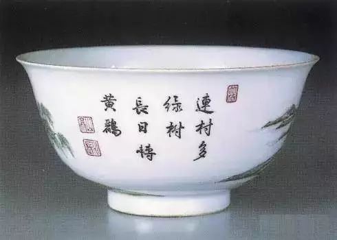 碗壁另一面墨书「连村多绿树,长日转黄鹂。」前后红彩书「竹石」、「山高」、「水长」三印。胎质细腻,胎薄透光。底蓝料书「乾隆年制」四字二行仿宋体楷款,外加双方框。