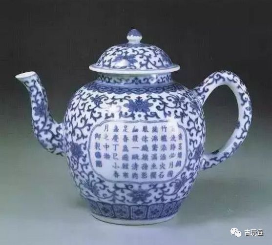 余隙及盖面把、把、流均绘转枝莲纹,盖纽一半涂青、半留白,颈饰卷草纹,底边莲瓣纹一周。底青花书「大清嘉庆年制」六字三行篆款。